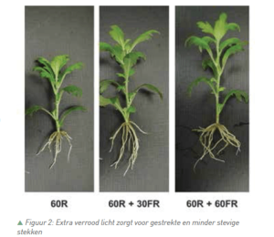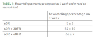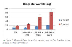 Chrysantenstekken werden beworteld onder 60 μmol/ m².s rood licht (60R), waar een extra fractie verrood licht aan toegevoegd werd: 30 μmol/m².s (30FR) of 60 μmol/ m².s (60FR). Het bewortelingspercentage na 1 week toont duidelijk aan dat verrood de start van beworteling bevordert. Meer dan de helft van de stekken zijn al beworteld wanneer verrood licht aanwezig is ten opzichte van slechts 5% zonder verrood licht. Na 2 en 3 weken waren de percentages voor alle lichtkleuren opgelopen tot ongeveer 100%. Het vroeger starten met de beworteling resulteert in een hogere droge stof zowel na 2 als 3 weken beworteling. De grote fractie verrood licht (lage rood:verrood verhouding) zorgt er echter voor dat de stekken heel sterk gaan strekken en minder stevig worden. Deze strekkingsgroei is niet gewenst bij een kwalitatieve jongplant chrysant. Om dit tegen te gaan zou het geven van extra blauw licht een oplossing kunnen zijn.