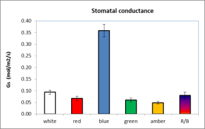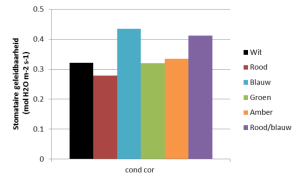 - Onder blauw en rood/blauw licht staan de huidmondjes verder open (geleidbaarheid is hoger)