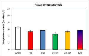 - Fotosynthese onder “eigen” lichtkleur gemeten: hoogst voor wit, laagst voor groen