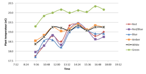 - Lucht- en planttemperatuur zijn het hoogst onder de groene LEDs